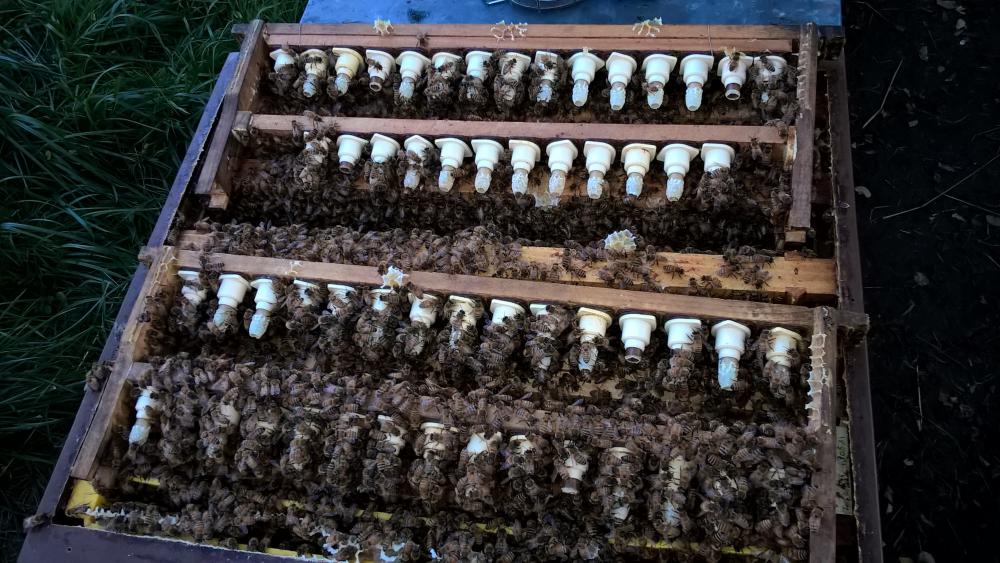 Les essaims sont vendus sur 5 cadres avec une reine F1, 3 cadres de couvain, 1 cadre miel/pollen, 1 cadre en construction.