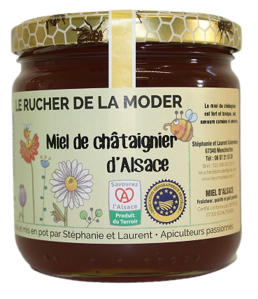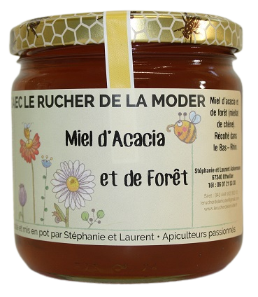 Suite à des gelées tardives de cette année 2022, la floraison des acacias étant partielle, nos butineuses ont récolté simultanément du miel de forêt apportant un subtile mélange de fleurs d'acacia, miellat et nectar.