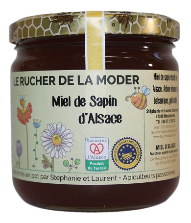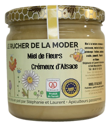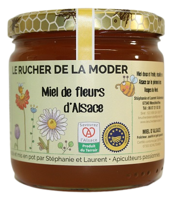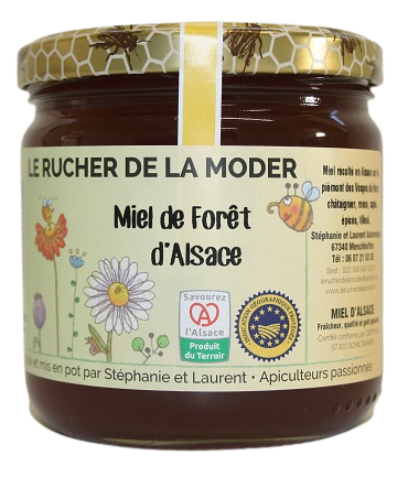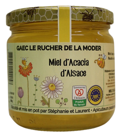 Suite à des gelées tardives de cette année 2022, la floraison des acacias étant partielle, nos butineuses ont récolté simultanément du miel de forêt apportant un subtile mélange de fleurs d'acacia, miellat et nectar.