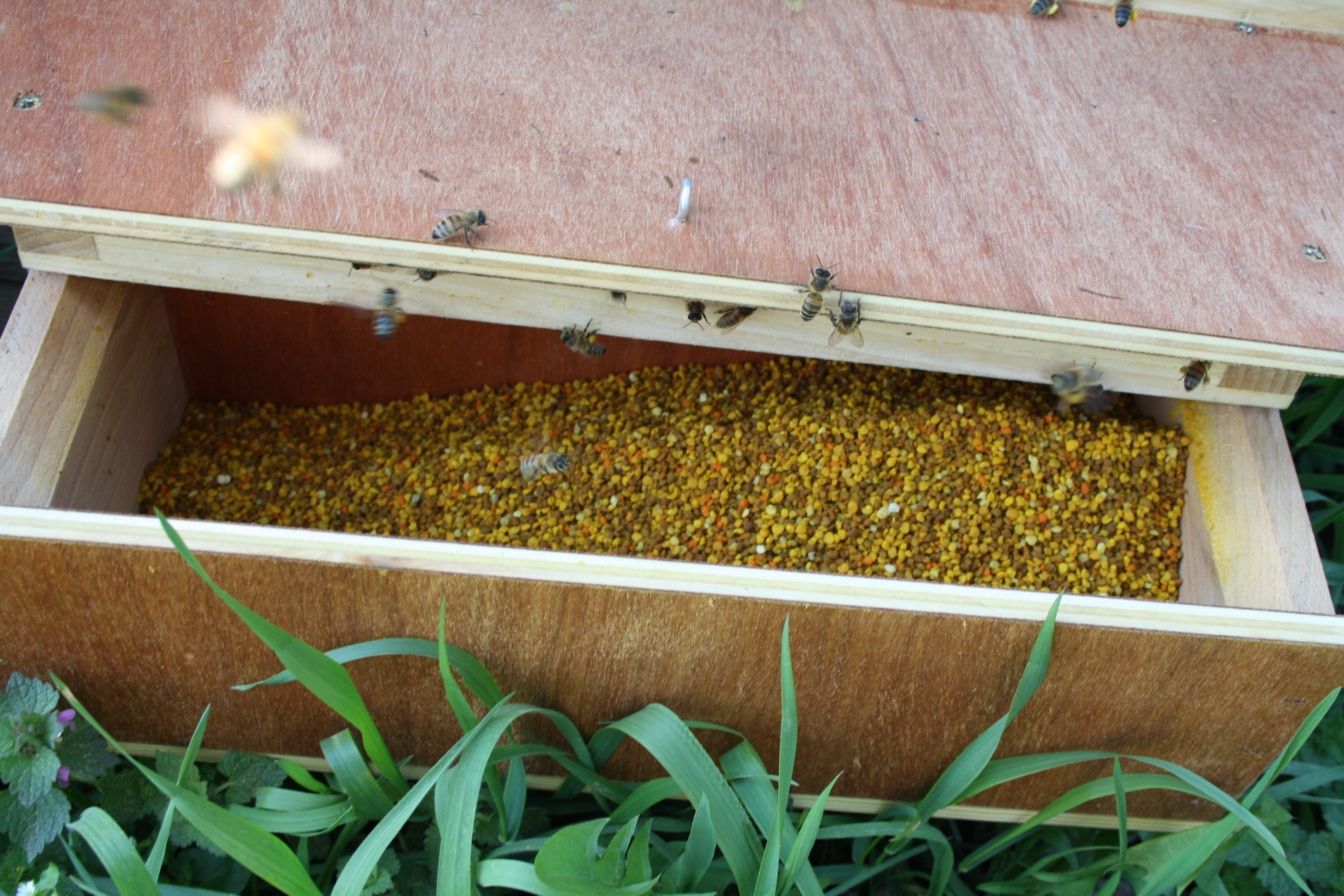 L'abeille doit alors traverser une grille (appelée peigne à pollen) qui retient les pelotes fixées à ses pattes arrière, celles-ci tombent dans un tiroir à pollen. Tous les 2 jours, nous effectuons la récolte. Le pollen est ensuite trié à l'aide d'un tarare puis congelé ou séché.